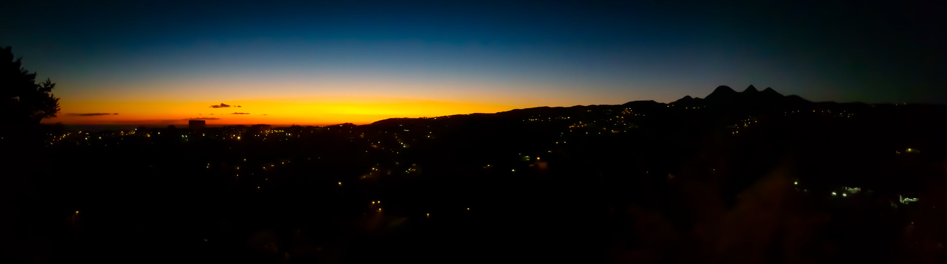 Vue aérienne ou en hauteur d'une ville de montagne ou côtière après le coucher du soleil. Les lumières chaleureuses des habitations contrastent avec le ciel sombre, offrant une ambiance nocturne et romantique.