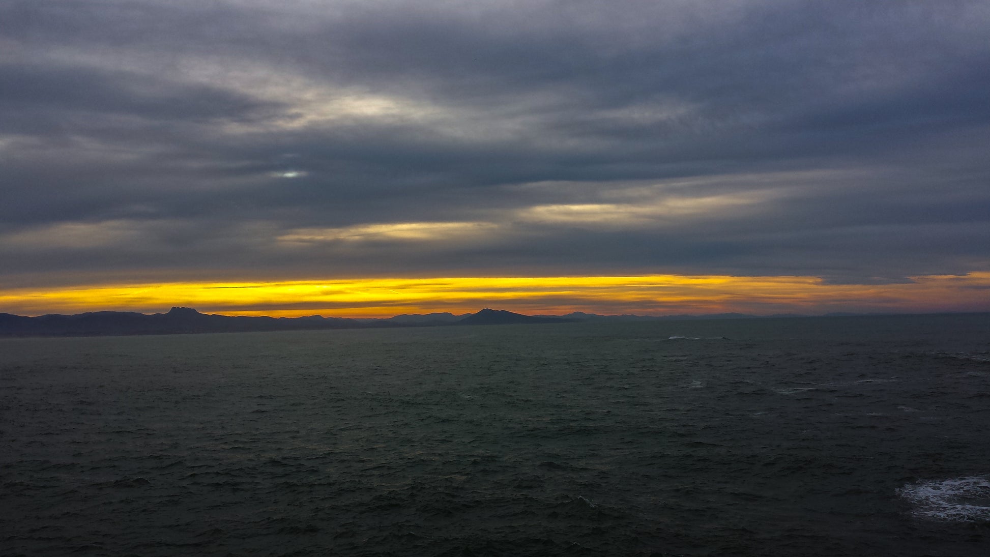 Paysage marin avec un fort contraste de couleurs au crépuscule. La ligne d'horizon est soulignée par une intense bande de lumière jaune et orange sous un ciel de tempête gris et sombre. La mer est agitée et houleuse.