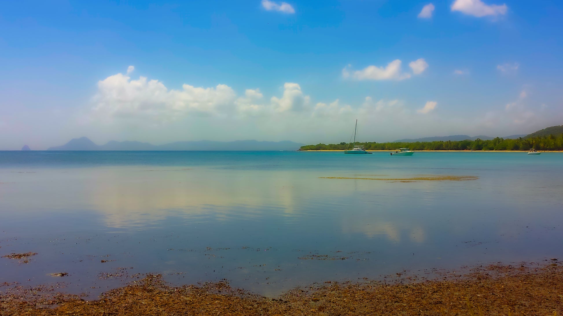 Paysage côtier serein avec une plage de sable et une mer turquoise très calme, reflétant le ciel bleu. Des voiliers sont ancrés près du rivage et une île brumeuse se dessine à l'horizon aux couleurs pastel.