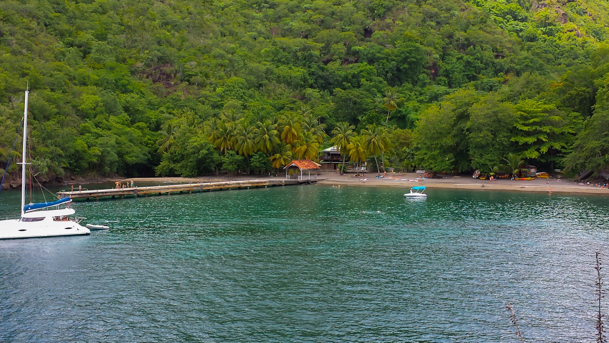 Vue d'une baie ou crique tropicale isolée, entourée d'une forêt luxuriante et verte. Un voilier à voile est ancré près d'un ponton menant à une petite plage. L'eau est calme et claire. Scène d'évasion, de vacances de luxe et de nature vierge. Idéal pour des thèmes de voyage, yachting, tourisme écologique ou aventure.